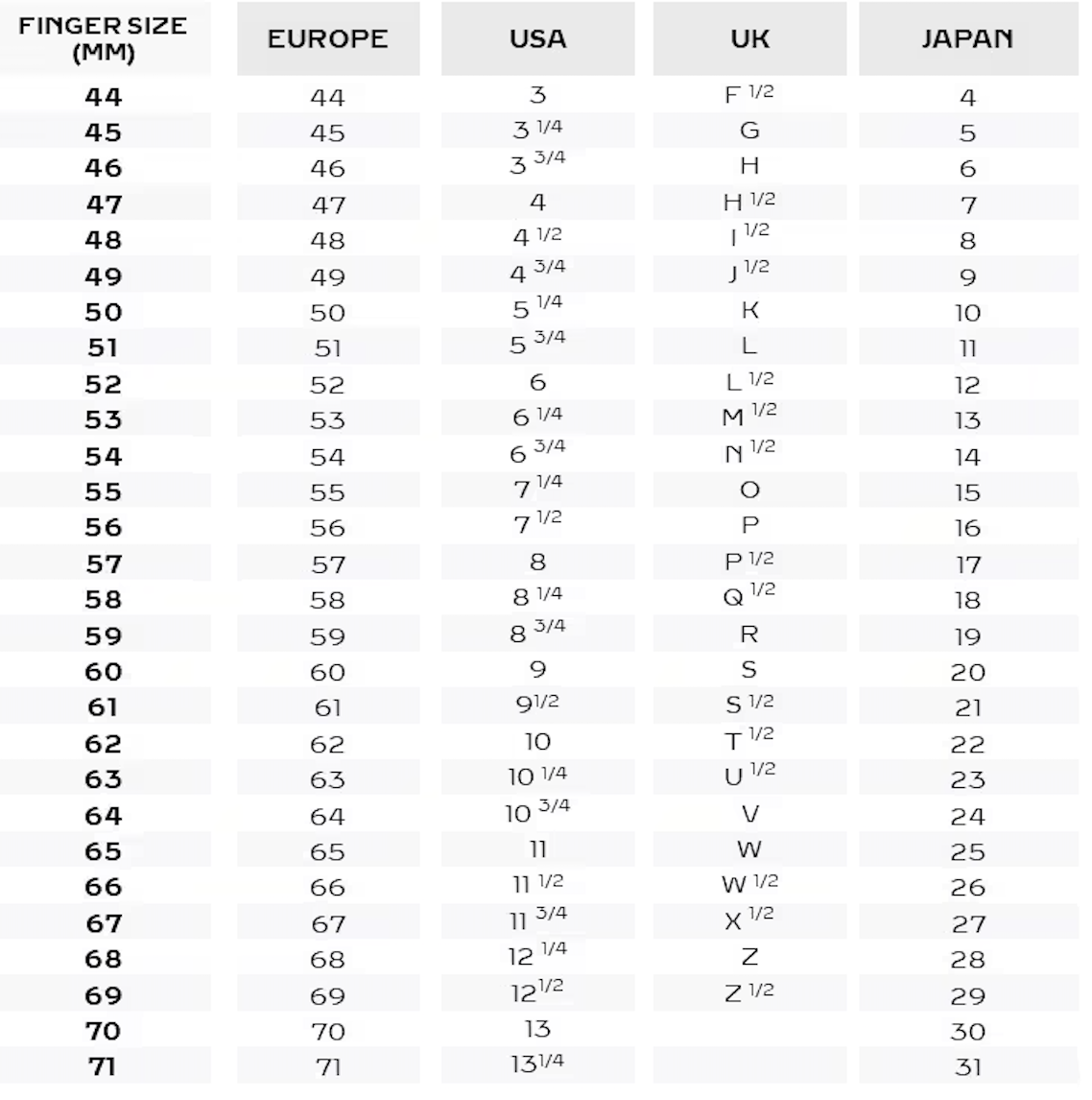 Use the size chart at the bottom of this page to match your measurement with the corresponding Brogan Tyler ring size. The first column ‘Finger Size (MM)’ is the measurement of your finger. All Brogan Tyler sizes are European.